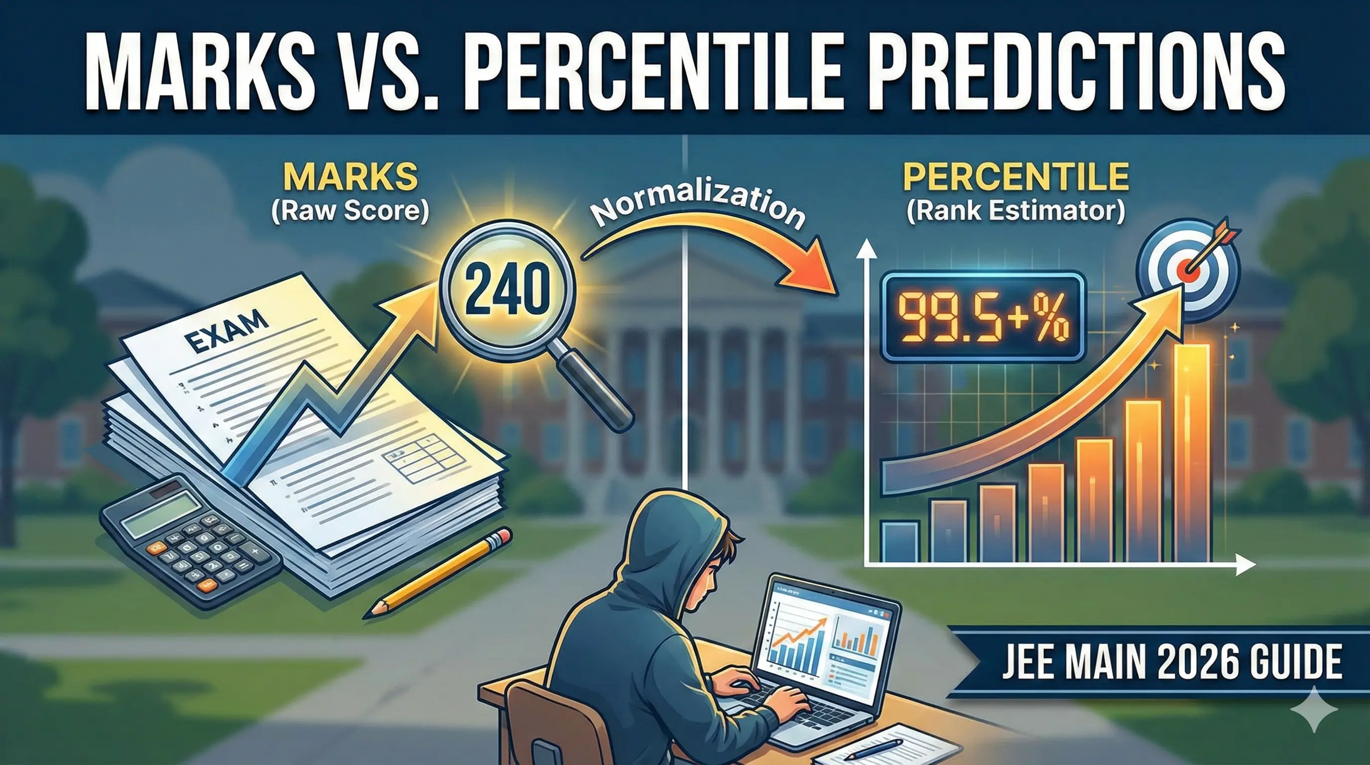 Predict your JEE Main 2026 percentile based on raw marks. Comprehensive analysis of normalization, shift difficulty, and predicted score-to-rank data for the upcoming session.